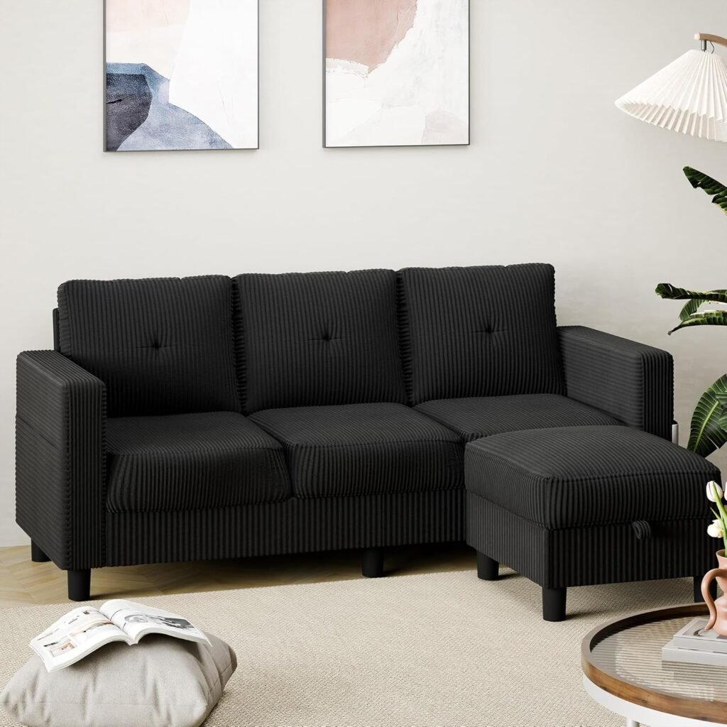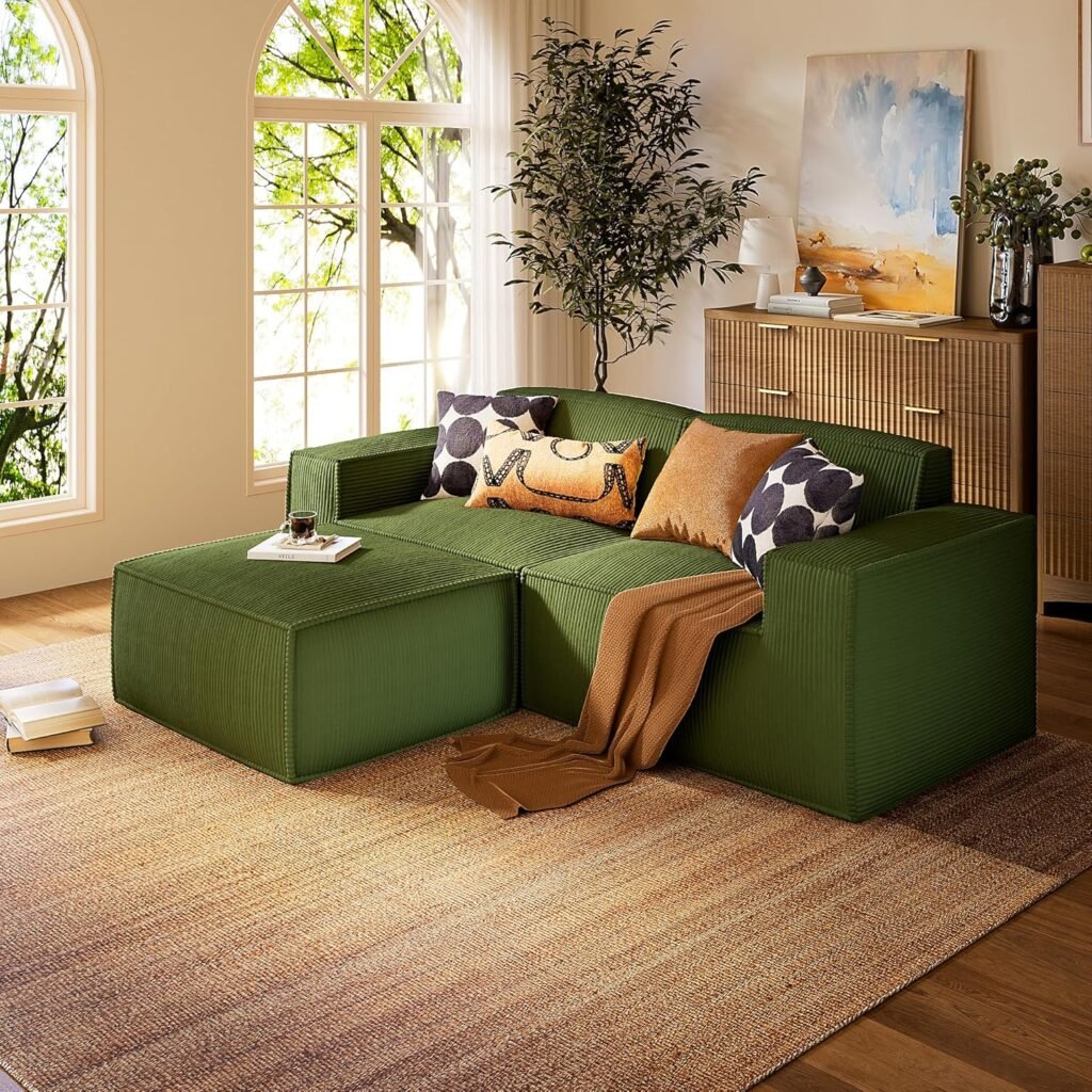 Customer review: “This couch is amazing for the price! We love it and have had it for several weeks. I will say comfort wise it is more firm that most because it does not have springs. It is a very good size especially for the price. It gives a ton of functional storage with the ottoman and it can be moved around in different ways to suit your room. We have it clipped together to avoid all the pieces moving around. The ottoman even has super strong grippy feet to keep it from moving/sliding around.” –