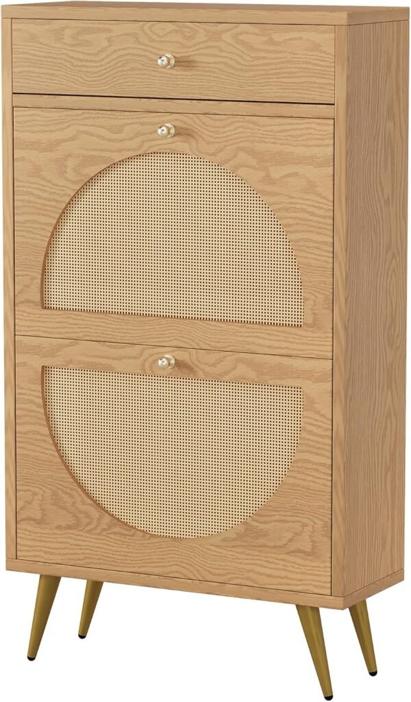Customer review: “Love this shoe cabinet! It arrived securely packaged and was very easy to assemble. The walnut color is really lovely and the brighter-colored insert makes it fit into any room style.” – Donna C.