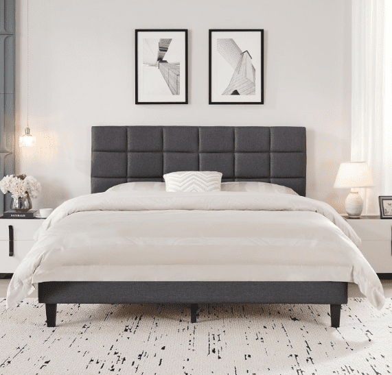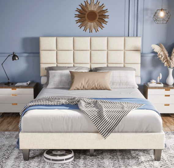 BedsPick Platform Bed with Upholstered Headboard, Queen, Beige or Gray